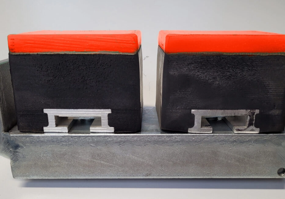 Aan de onderzijde van de impact bar zit een aluminium T gleuf profiel gegoten. Het aluminium profiel dient om de impact bar te kunnen monteren aan het draagframe.